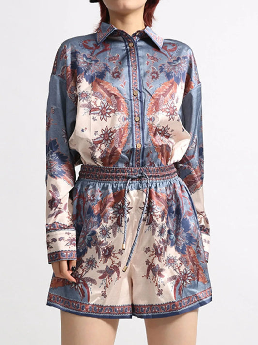 Printed Button Front Long Sleeve Shirt and Shorts Set