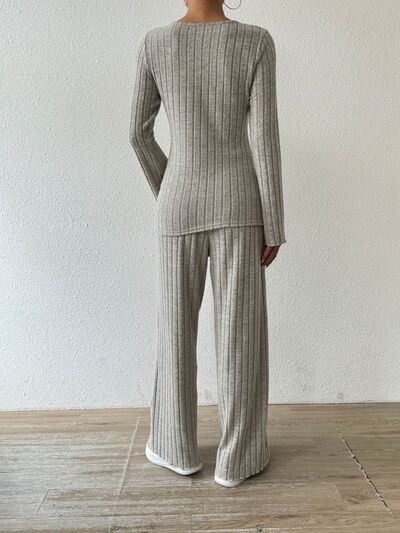 Ribbed V-Neck Long Sleeve Top and Pocketed Pants Set