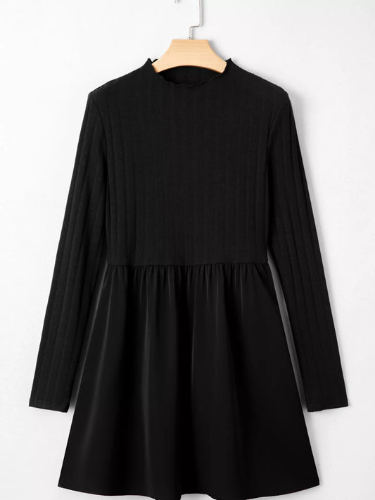 Frilled Neck Ribbed Knit Patchwork Long Sleeve Mini Dress