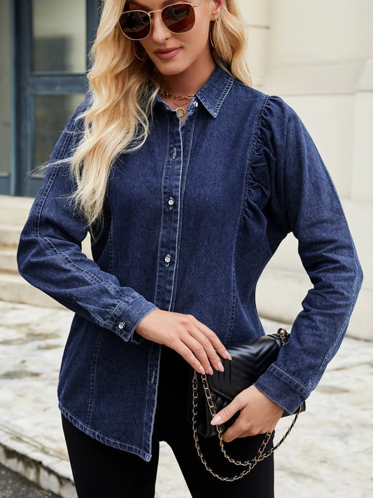 Collared Neck Drop Shoulder Denim Top