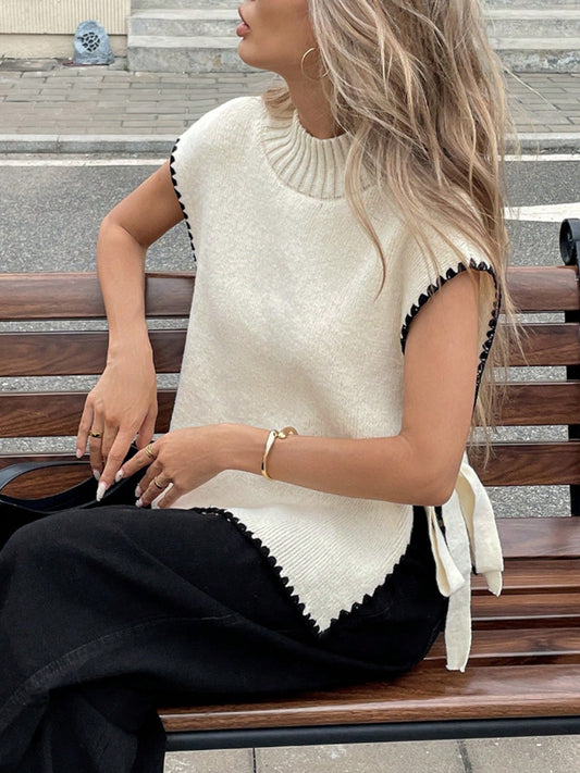 Side Tied Contrast Trim Mock Neck Sweater Vest